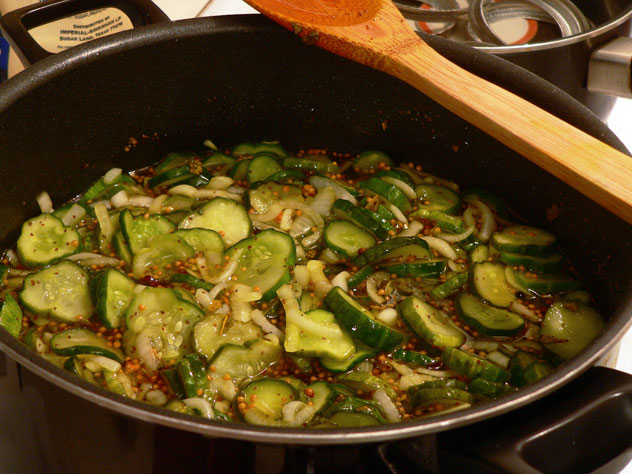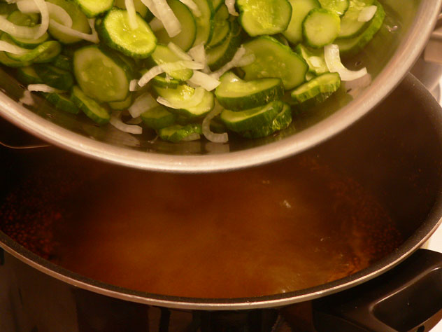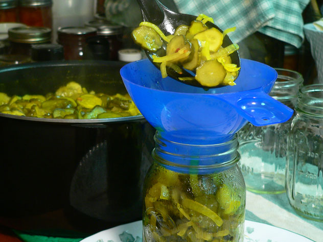 I use a slotted spoon to fill the jars first, filling it all the way to the top of the jar with the heated cucumbers and onions. Then, I use a ladle to fill the jar with liquid from the pot. Everything is good and hot so be careful. Kids should be allowed to watch from a safe distance.