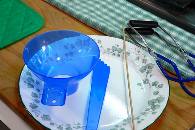 On my counter, I place the utensils to actually fill the jars. I lay out a cloth at the back to place the sterilized jars on once I pull them from the boiling water. I have a hot pad for the pot when it comes off the stove. I also use a plate to place my jars in while I fill them. It just makes cleanup easier for me.
