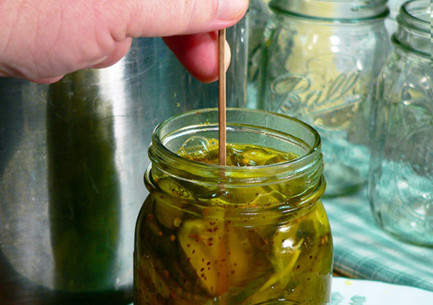 Once the jars are filled, take the wooden skewer, or a butter knife, and run it around the inside edges of the jar. This will allow any air bubbles in the bottom of the jar to slide up the skewer to the top where they will burst and release. You probably will not get them all but you need to get out as many as possible.