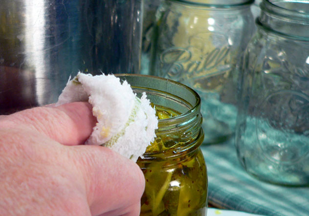 When the jar is filled correctly, gently wipe the very top and all around the thread portions of the jar with a clean, damp cloth. You don’t want any liquid or food particles on the top surface as it may prevent the seal on the lid from sealing properly. Any food particles, or syrup, around the outside threads could cause the band to stick and be difficult to remove later. Just wipe it carefully and clean it well.