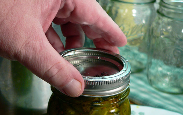 Next, place one of the jar bands over the lid. Make sure the band is seated properly before you begin to tighten it. All canning recipes will call for the jar band to be tightened “finger tight.” That means you just snug it down without trying to force a bunch of pressure into tightening up the band. If it’s too tight, it will keep the air inside from escaping and could cause an improper seal.