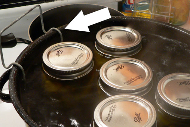 The handle of the wire rack has a bend in it. This bend is placed on the outer rim of the canning pot and keeps the jars up high in the water until all the jars have been loaded in the rack. This particular rack will hold up to seven pint size jars. If you don’t have enough jars to fill the rack, try to spread them out and balance out the load. When the rack is loaded, carefully lift up on the handles and lower the rack into the hot water below. The jars may try to slip and move around as you do this. Quickly straighten them back up before folding the handles down on top of the jars.
