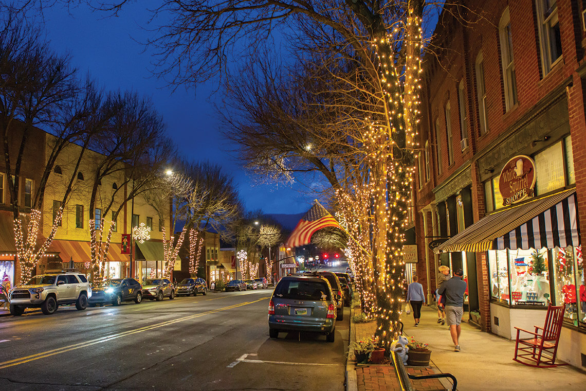 Downtown Brevard shines with trees draped in lights, illuminated snowflakes, and businesses decked out for Christmas. Festivities begin in earnest on December 4 with the Downtown Holiday Stroll. photograph by Tim Robison