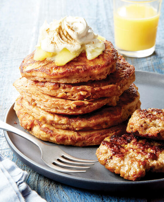 For the pancakes: In a large bowl, mix together flour, baking soda, baking powder, brown sugar, salt, and cinnamon.