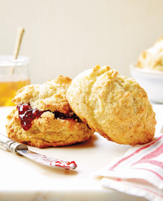 Using a greased ¼-cup measure, portion the dough and drop biscuits onto the prepared baking sheet, spacing each about 1½ inches apart.