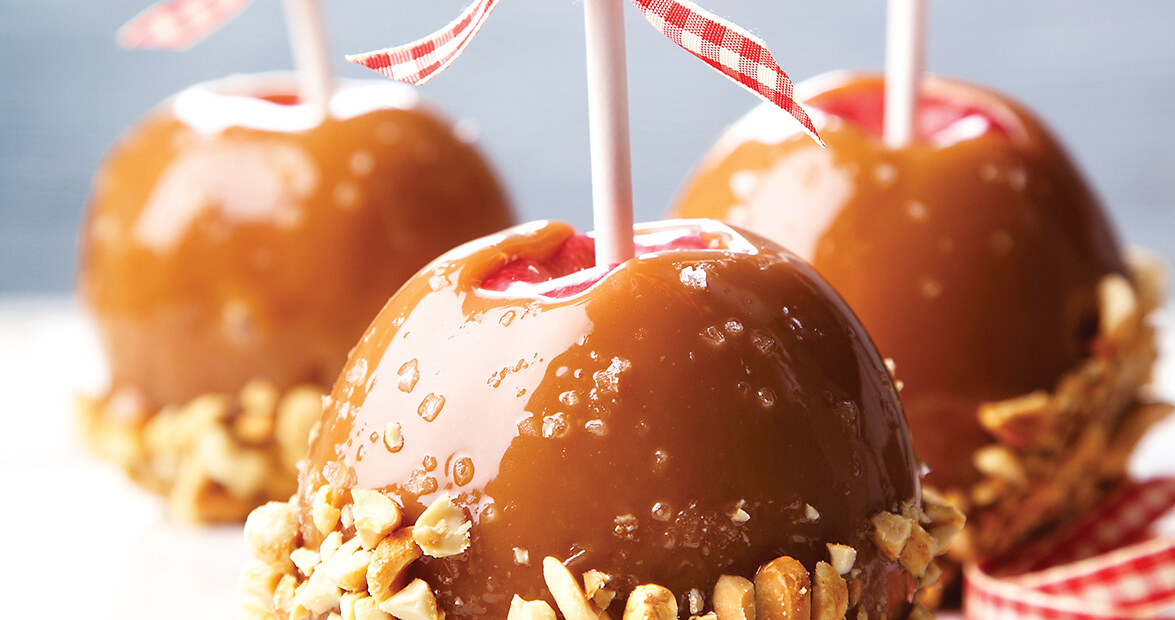 Dip each apple into hot caramel mixture; turn to coat. Dip bottom of apples into peanuts. Sprinkle apples with coarse salt (optional). Place on parchment paper until set. Keep caramel apples in refrigerator until ready to serve.