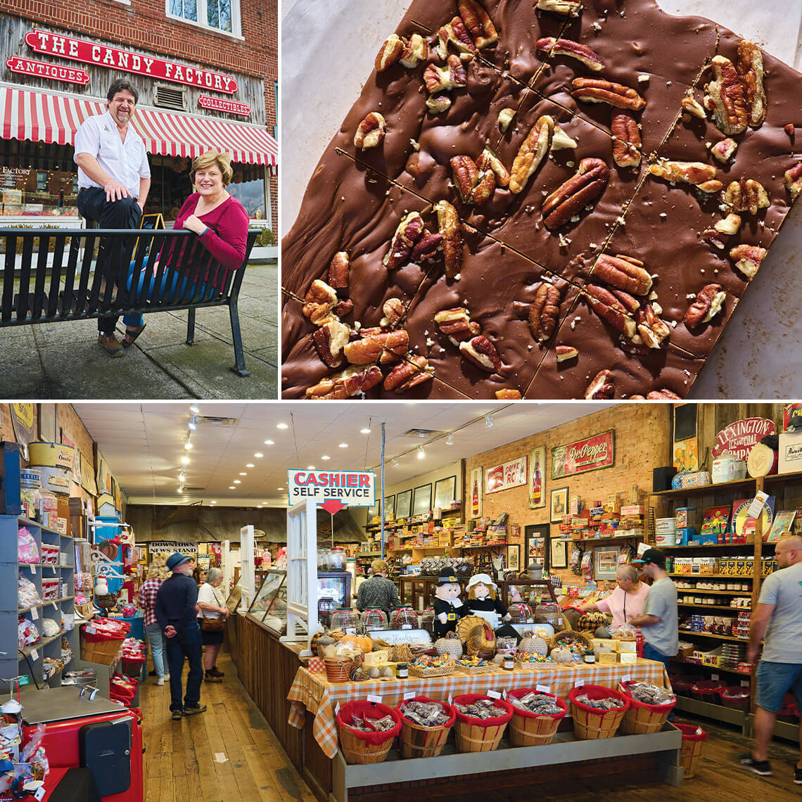 Behind the iconic red-and-white awning on Main Street in Lexington, Wynn and Annette Conrad continue a tradition that began more than 40 years ago. In 1978, Robert Ebelein — the second-generation candymaker who owned Piedmont Candy Company with his wife, Frances — set up a small shop on the company’s property to sell his family’s homemade fudge and peanut brittle. The next year, he bought and renovated the 1890 Lexington Hardware building downtown and opened The Candy Factory. The Conrads took over from the Ebeleins’ three daughters in 2018. They keep wooden barrels and glass jars filled to the brim with the treats of yesteryear, like rock candy, Bottle Caps, and, of course, Piedmont Candy’s Red Bird puffed mints — plus the creamy homemade fudge that launched a legacy.