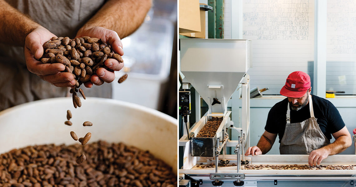 Chocolate makers like Sam Ratto transform beans into bars, while chocolatiers (Videri employs three) turn those bars into truffles, peppermint bark, and other goodies. photograph by Anna Routh Barzin