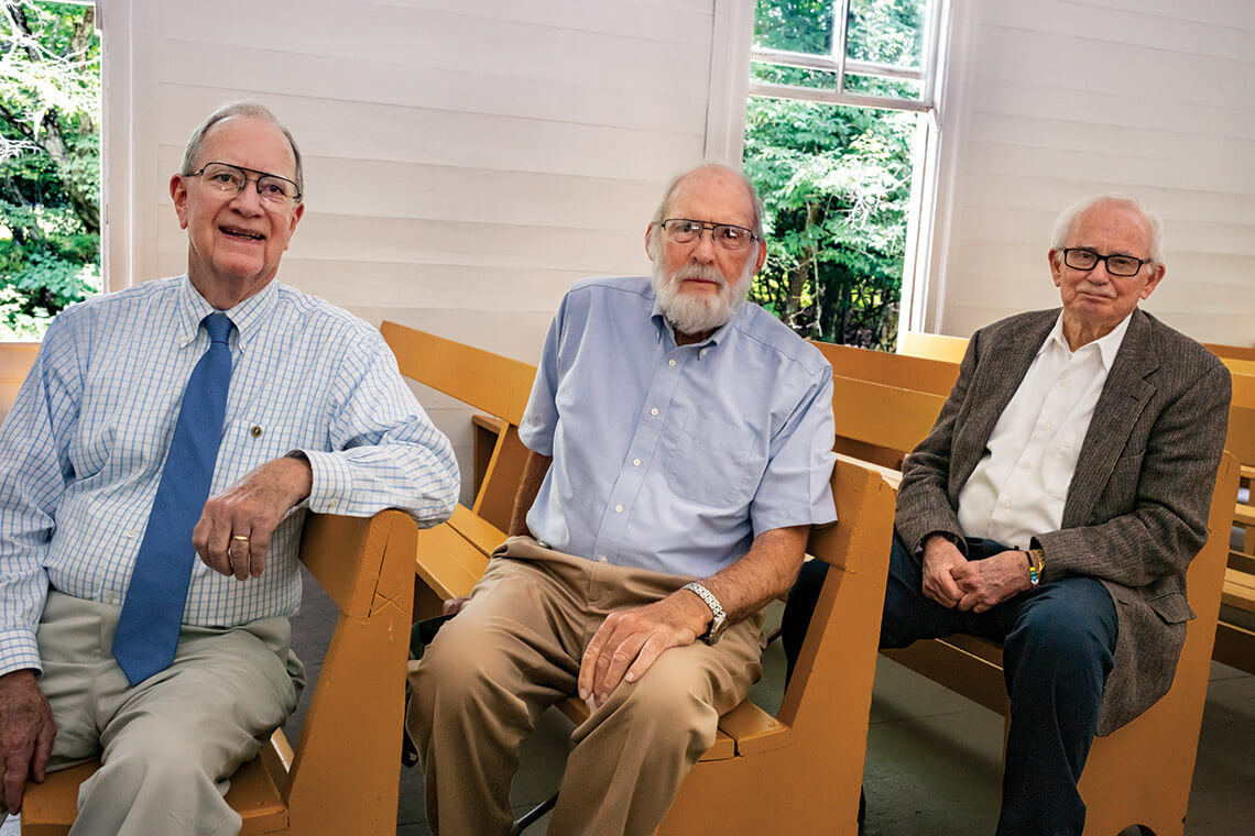 The annual reunion is an opportunity for folks with roots in the Cataloochee Valley — like (from left) Steve Woody, Harold Hannah, and Wade Boone Caldwell — to reconnect. photograph by Charles Harris