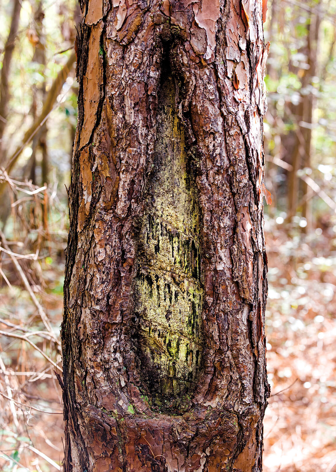 “There it is,” Kelly says, nodding toward a thicket of pine trees, shrubs, and vines. I follow his gaze to a broad longleaf. From about knee-high to head-high, an oval of bark is missing from the trunk, the cambium slashed with deep gouges. From a distance, those grooves do, indeed, look like whiskers.