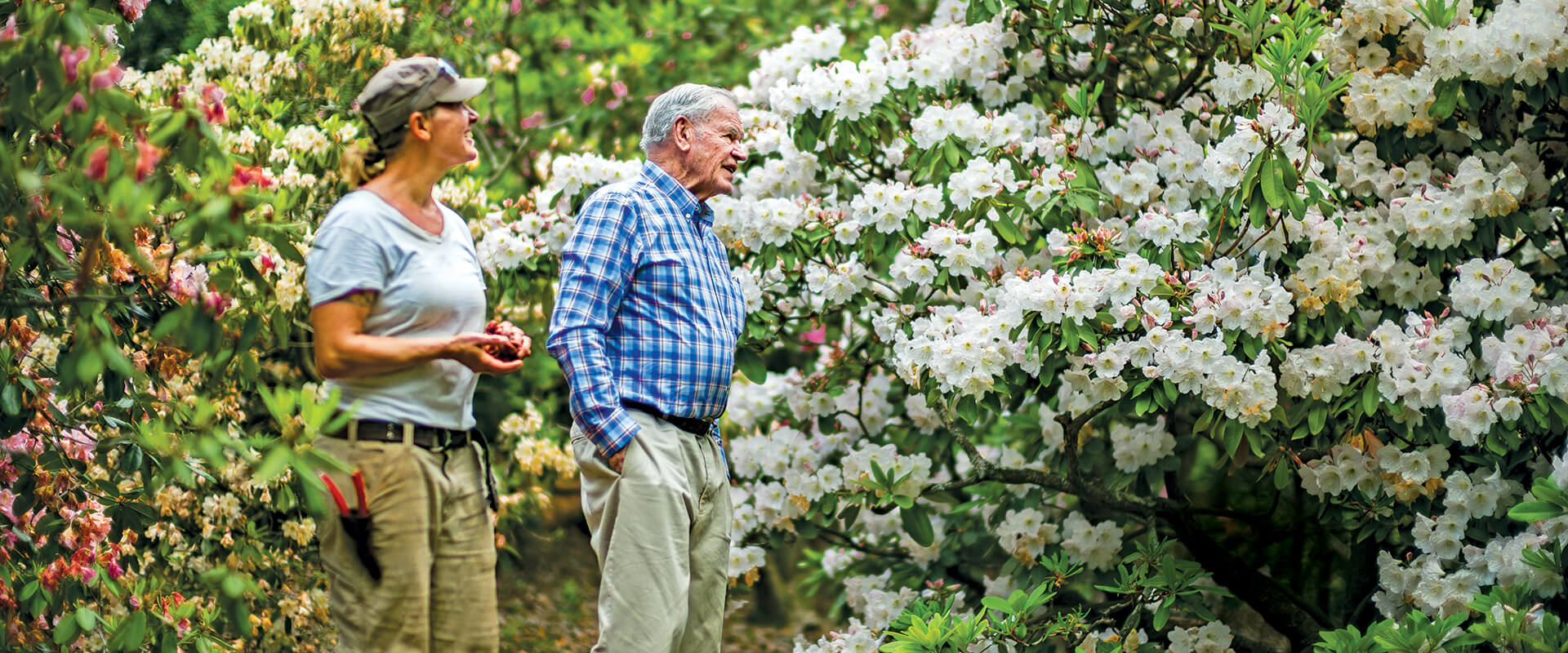 Tricia Ockinga and Charlie Owen admire the rhododendron that was Charlie’s mother’s favorite. “I call it Her Majesty,” Tricia says. “She’s queen of the garden because she’s always loaded with blooms, and the fragrance is heavenly — almost like jasmine and orange blossoms.” photograph by Charles Harris