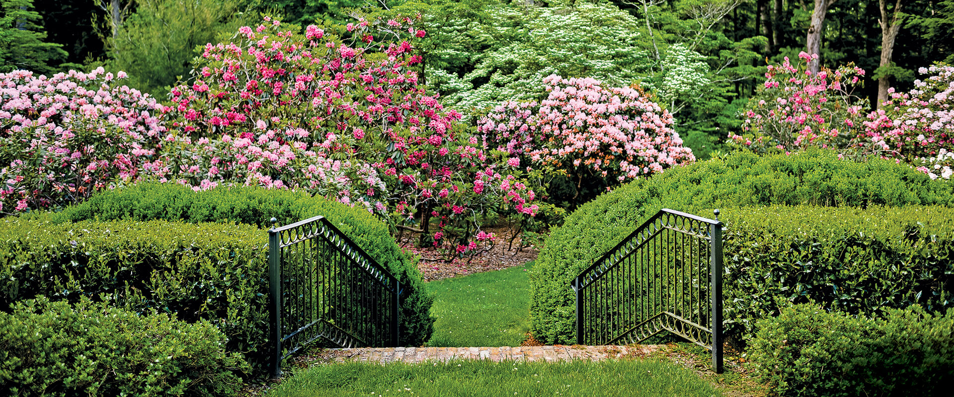 Over the years, the Owens have held parties on the brick terrace that overlooks these rhododendrons — and Tricia always eats lunch here, in the company of flowers. photograph by Charles Harris