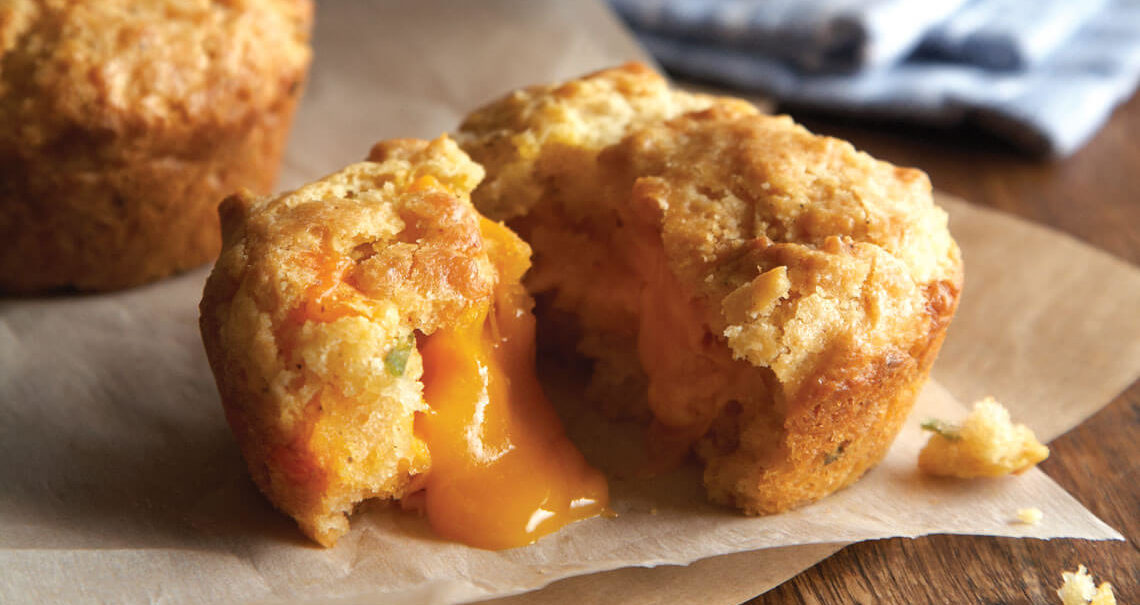Put 1 heaping tablespoon of mixture in each muffin cup. Pinch off ¾-inch chunks of cheese, and place in the center of the batter. Spoon about 1 heaping tablespoon of batter over each piece of cheese, pushing it around the edges to seal in cheese.