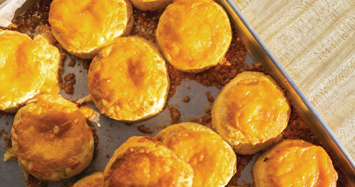The eastern part of the state is known for cheese biscuits for reasons lost to history. Abrams restaurants claim to be the “home of the original cheese biscuit” and place a large hunk of hoop cheese (milder than Cheddar) inside each biscuit while it’s still hot, which is the typical approach. Mom’s Grill in Washington, located inside a convenience store, uses sharp Cheddar