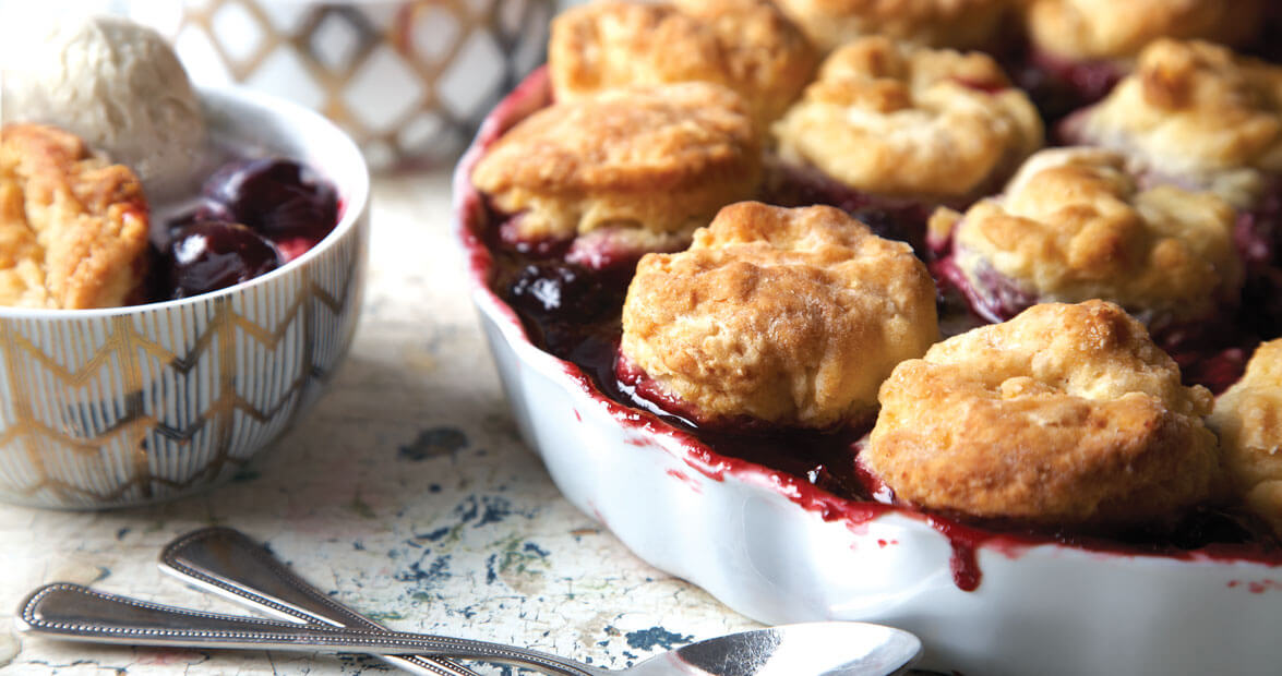 Place cobbler on a baking sheet and bake for 10 minutes. Reduce heat to 350 ̊ and bake for 55 to 60 minutes or until biscuits are golden brown. Remove from oven and let sit for 10 minutes. Serve with vanilla ice cream.