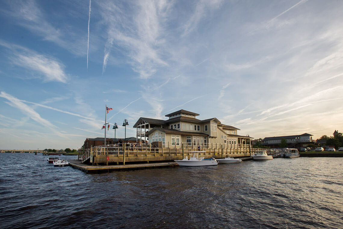 In New Bern, that means seafood like peel-and-eat local shrimp or jumbo crab cakes, as well as produce sourced from surrounding farms to make unparalleled salads and the famous Carolina Gold rice, grown in paddies just over the bridge. Sit outside and watch the boats come in or enjoy the sunset from the floor-to-ceiling windows that surround the restaurant.