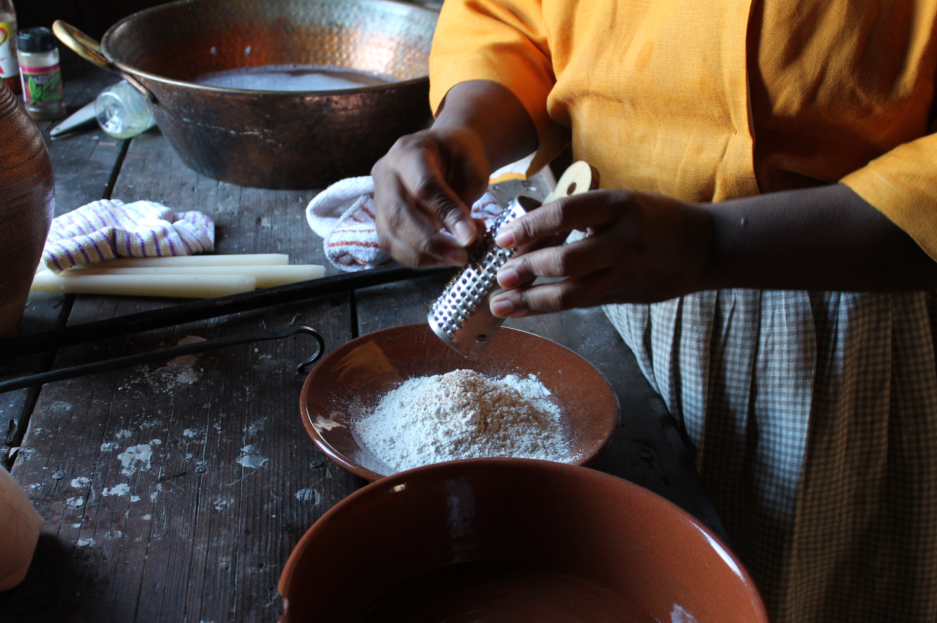 Clarissa Clifton, who has been serving as a volunteer food historian at Latta, meets me in period costume to show me the kind of living history cooking demonstrations she provides visitors. It is one of her last days in North Carolina before her paid job in information technology moves her to Atlanta.