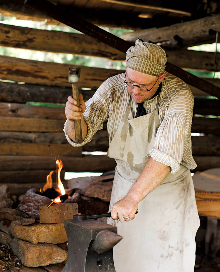 Across the fort grounds, these reenactors demonstrate the trades that were vital at the time. Here, a brickmaker uses a wooden form to mold bricks, setting them aside to bake in the sun. There, under a three-sided shed, a blacksmith labors over an anvil, hammering glowing iron into hardware. By an open fire, a chandler dips wicks into hot tallow and beeswax before hanging them to dry.