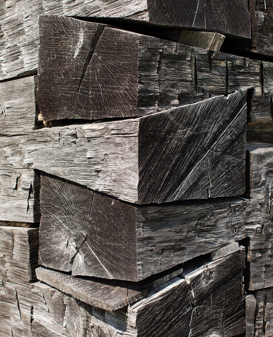 Broadax and adze marks on the dovetail corner joints show age on the fort. photograph by Revival Creatives