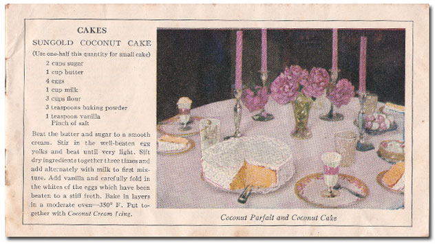 Here’s the cover of the little recipe booklet. I picked this up at the weekly auction I attend just a couple of days after realizing I would be making a coconut cake. I bid on a small box of old papers and was happily surprised when I found this towards the bottom of the box. What are the odds that would happen? I had no idea it was in the box when I bid on it. photograph by Steve Gordon