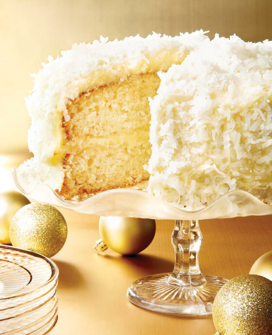 To assemble, use a large serrated knife to slice a thin layer off the tops of the cake layers to create a flat surface. Place one layer on a cake plate and evenly spread about 1½ cups of icing on top. Top with the other cake layer. Using an offset spatula, spread the remaining frosting over the top and sides of cake. Cover the cake with coconut, sprinkling on top and pressing into sides. Refrigerate for 2 hours before slicing.