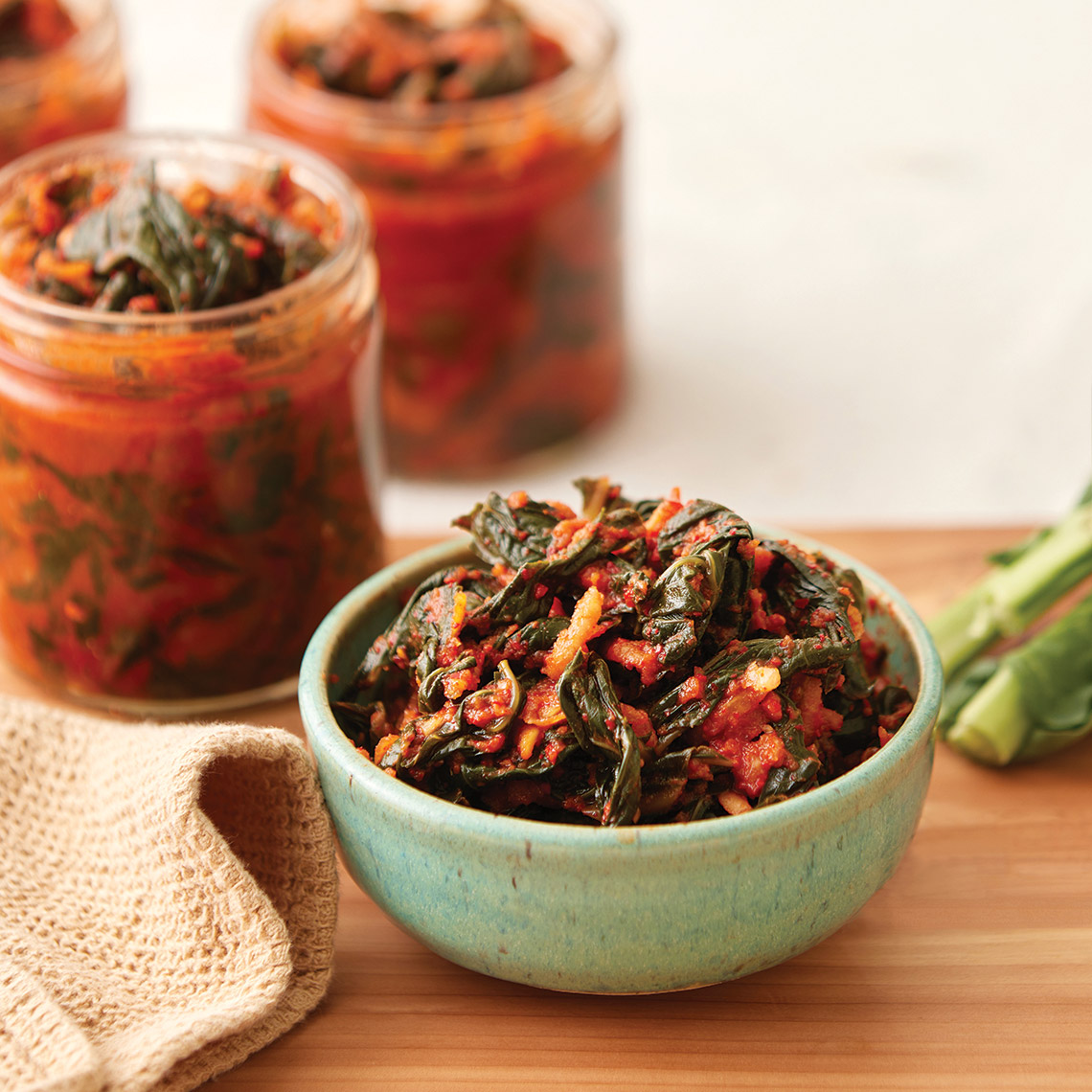 To make her collard greens kimchi, Chang combines collards with traditional Korean ingredients and lets the spicy mixture ferment for three to five days. photograph by Alex Boerner