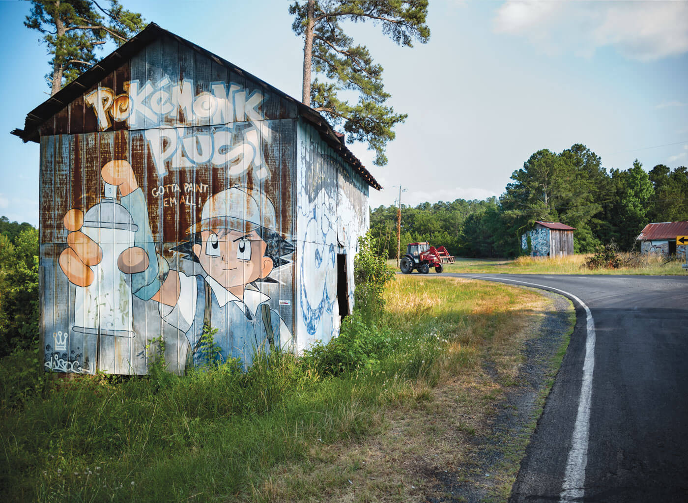 They smile, take a few more shots of each other, a few selfies, then drive away. Leaving me alone to experience the paintings as a kind of surprise in the landscape: art amid the kudzu. These barns won’t be here forever. Some of them are already gone; others are beginning to collapse from the inside. Grass and vines have obscured all but a handful.