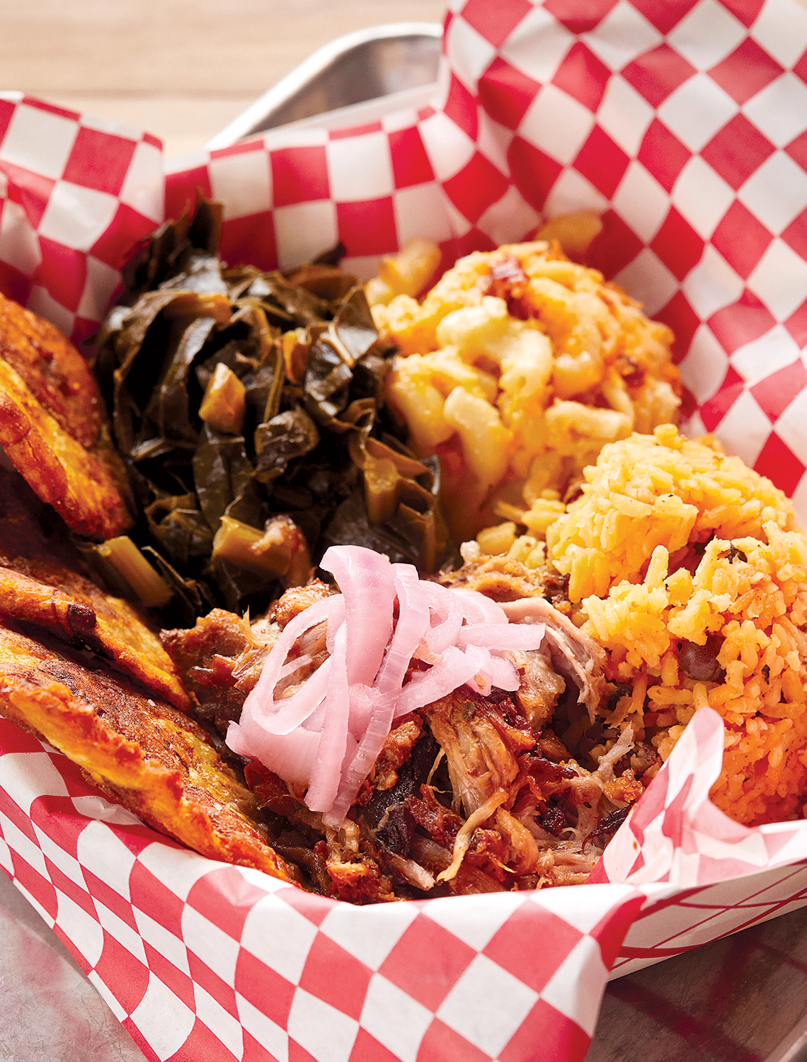 Take the Boricua Soul Bowl: A glossy heap of collards huddles next to a tangle of shredded pork — though this isn’t the eastern-style barbecue it appears to be. It’s slow-roasted Puerto Rican pernil, topped with quick-pickled red onions. A scoop of mac ’n’ cheese fits comfortably beside a scoop of arroz con gandules, a Puerto Rican staple of rice speckled with pigeon peas. Crunchy, salty tostones — slices of green plantain, smashed and fried twice — look like bursts of sunshine atop a platter that shines light on a nuanced story of the South, rooted in Black foodways and cross-cultural influences.
