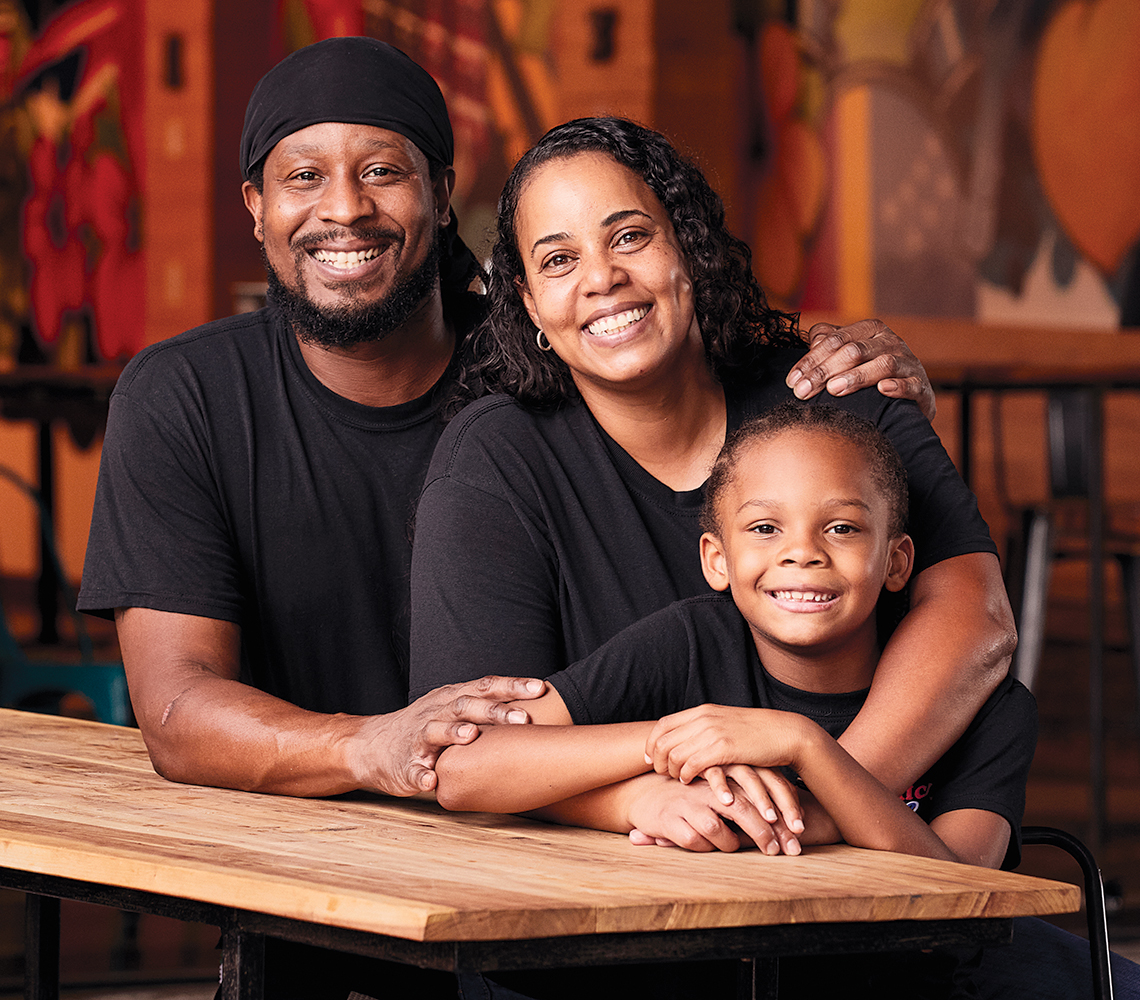 Inside Boricua Soul, a mural featuring Toriano and Serena Fredericks’s grandmothers watches over the couple and their son, Devin. photograph by Alex Boerner