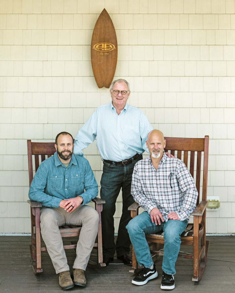 Tommy Morrow (standing) opened Atlantic Beach Surf Shop — known as AB — in 1964. Sons Chuck (left) and Johnny began working in the shop around age 12, and continue the family business today. photograph by Baxter Miller
