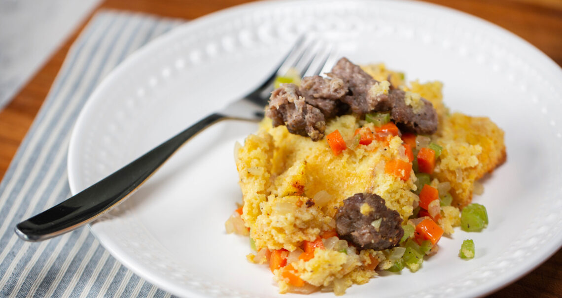 Cut the cornbread into 1-inch cubes. Butter the casserole dish and spread cornbread in the dish. Scatter in the cooked vegetables.