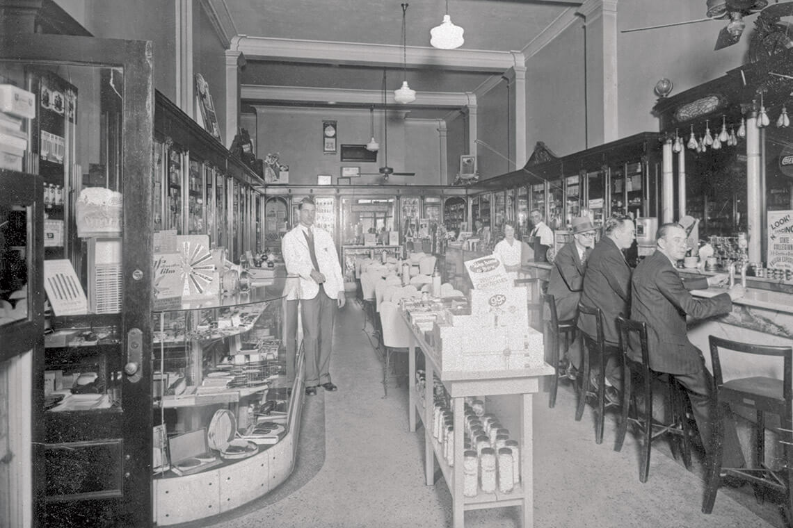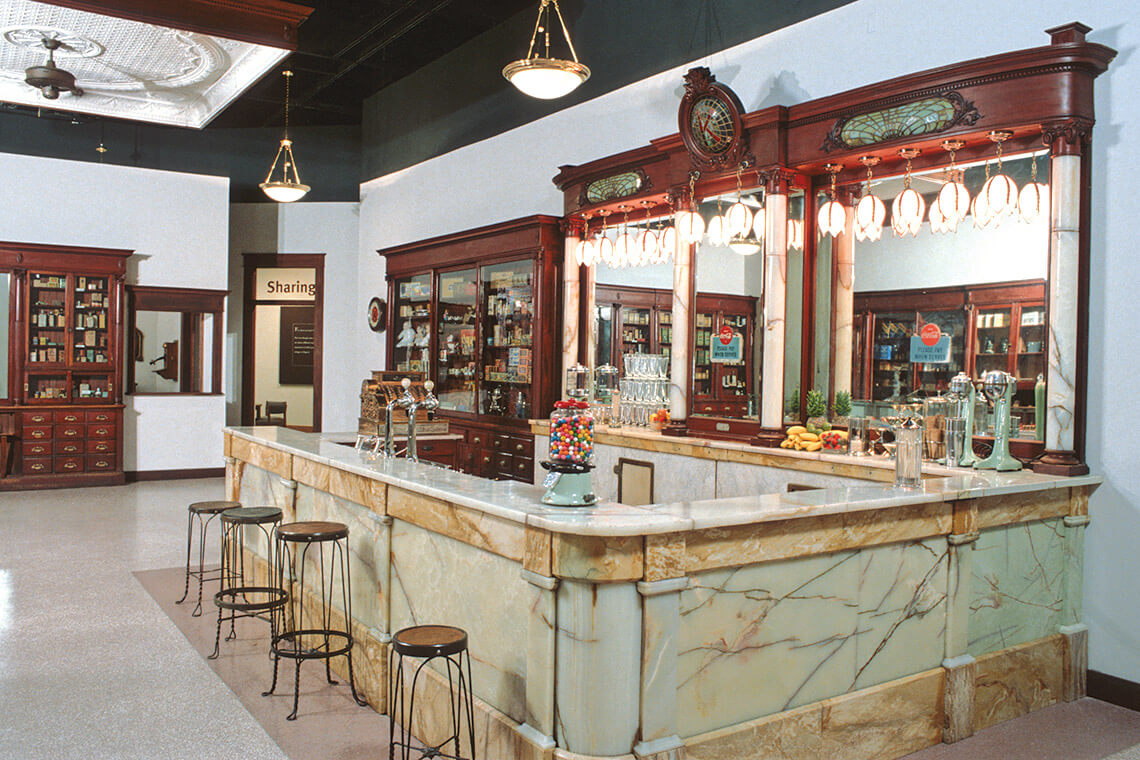 At the North Carolina Museum of History in Raleigh, visitors can see an example of a historic pharmacy counter, where a placard explains that pharmacists such as New Bern’s Pepsi-Cola founder Caleb Bradham “learned to advertise their drugstores as social gathering places, where customers could gossip and swap stories while eating ice cream or sipping soda.”