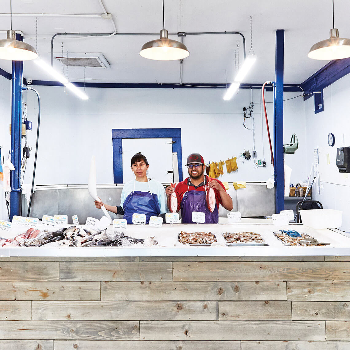 At Washington Crab’s retail market and processing location, senior fishmongers Manuela Hernandez and Cristhian Perez can tell customers everything they need to know about cleaning and dressing the fish and crabs on tap. photograph by Chris Rogers