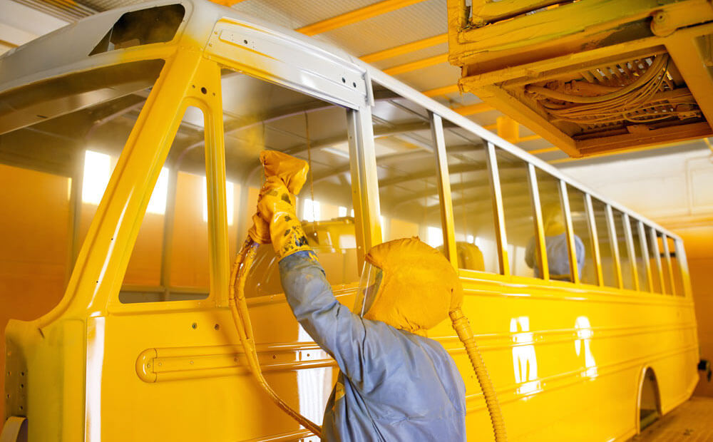 Fresh coats of paint are applied to Thomas’s latest bus. photograph by Jerry Wolford & Scott Muthersbaugh