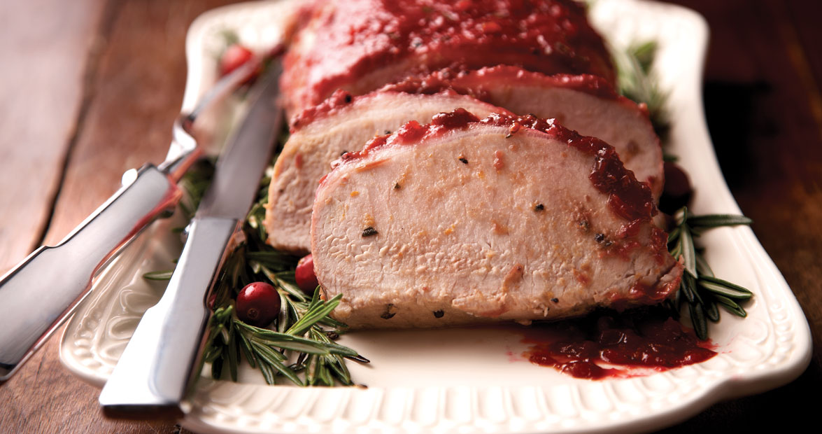 Meanwhile, combine the cranberries, orange juice, zest, and brown sugar in a saucepan; cook over medium heat until cranberries are soft, approximately 15 minutes. Let cranberry mixture come to room temperature. Place it in a food processor and pulse 10 to 15 times or until smooth. Spoon ½ cup of cranberry glaze over roast.