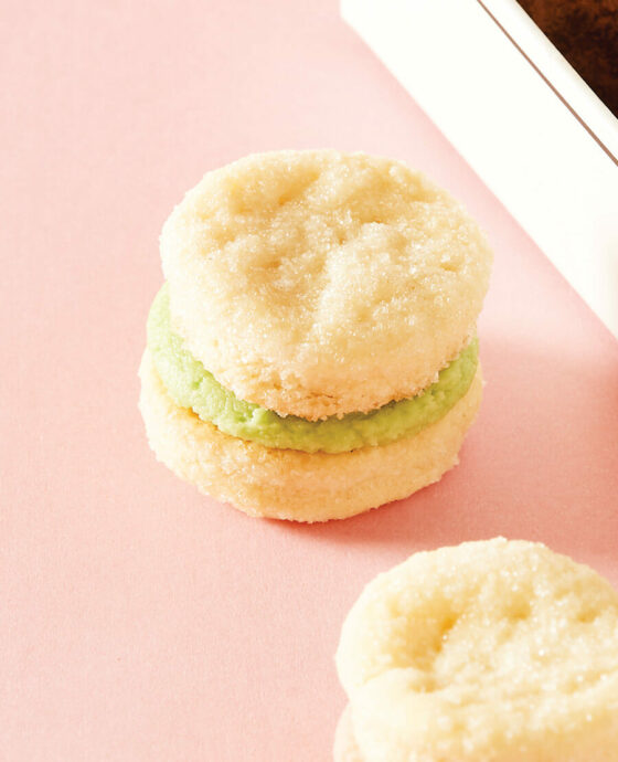 For the cookies: Mix well butter, cream, and flour. Chill. Heat oven to 375°. Roll out dough ⅛-inch thick on floured board. Cut with 1½-inch cutter. Roll out only ⅓ of dough at a time; keep the rest refrigerated. Transfer rounds to waxed paper heavily covered with granulated sugar. Turn each round so that both sides are coated. Prick with fork about 4 times. Bake 7 to 9 minutes. Let cool.