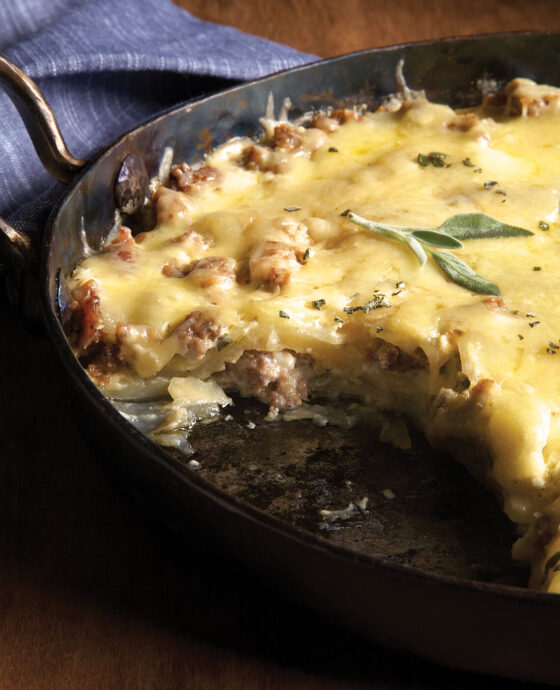 Layer half of the potatoes in the prepared dish, making sure to get into the corners; season with ¼ teaspoon salt. Evenly distribute half of the cooked sausage over potatoes. Pour half of the cream mixture over sausage; top with half each of the Cheddar, Parmesan, and butter. Repeat layering, then cover dish with foil.