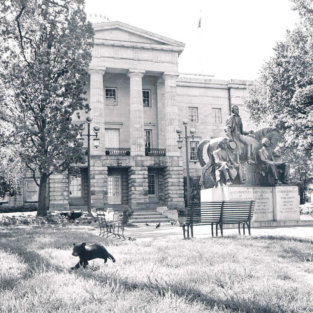 The little cub in these pictures was 10 weeks old when legendary photographer and Grandfather Mountain proprietor Hugh Morton took him on the road. In April and May of 1972, the cub appeared in 28 programs on 16 television stations and was photographed being adorable in front of landmarks across the state. It was all part of a bond campaign to raise money to create the North Carolina Zoo. The strategy worked.