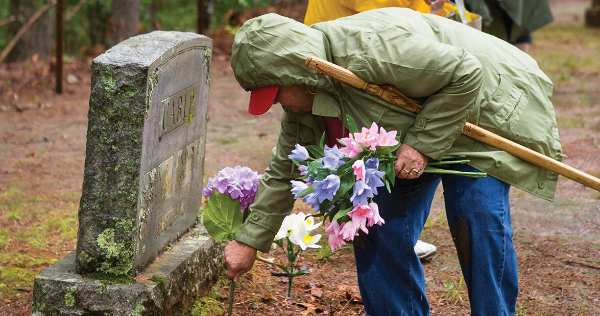 The rain picks up as Helen carefully steps through a gate in a simple wire fence, flowers in hand, her white hair damp, water speckling her glasses. Each grave gets a silk flower with a plastic stem. Except for Samuel Cable, “the main man,” says a woman nearby. Nearly everyone buried here, more than 160 people, is descended from him in some way or other, and his final resting place is covered with dozens of cloth and real flowers, in yellow, orange, and blue.