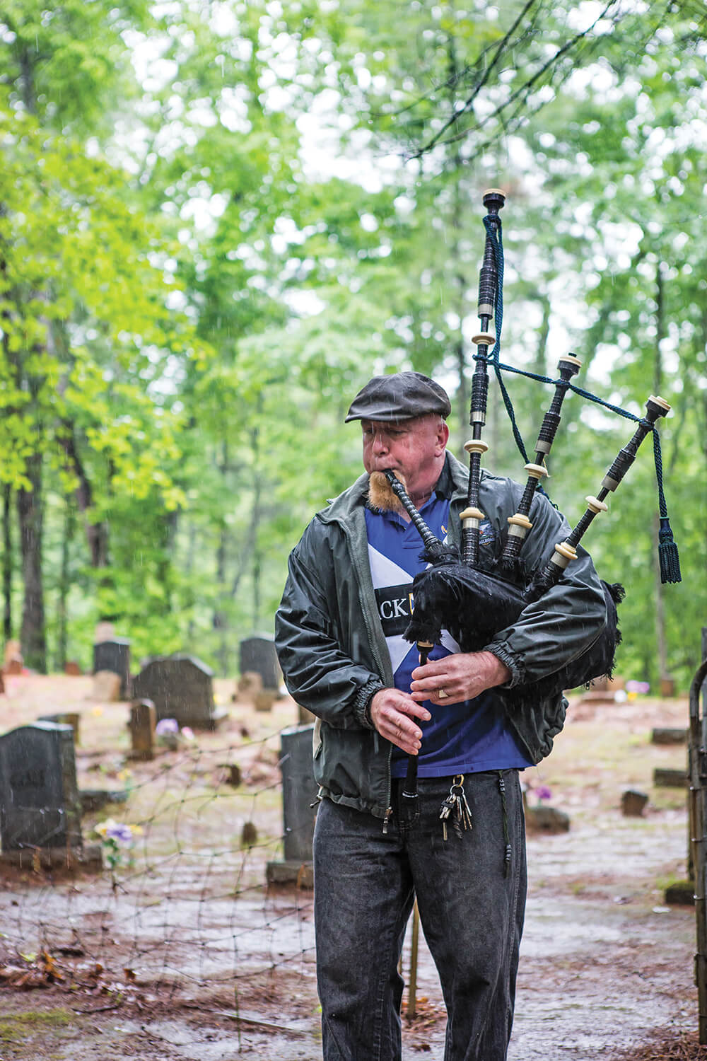 A bagpiper steps into the rain to play “Amazing Grace” after a hymn sing-along. After music, folks chat over lunch. photograph by Tim Robison