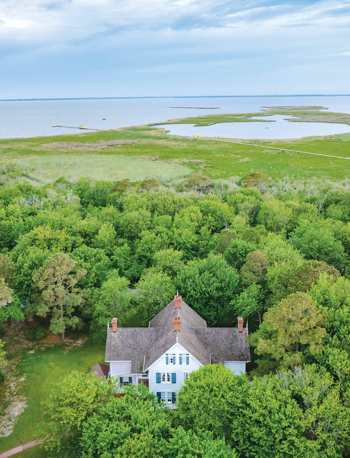 “Hammocks” — or “hummocks” — refer to marsh islands like the ones that make up the Beaufort archipelago buffering Taylor Creek from Onslow Bay and the open Atlantic. Some think this storied home is the White House, a dead reckoning that appeared on early nautical charts dating to the 1730s, warning mariners of Beaufort Inlet. The original house may have operated as an “ordinary” — a roadhouse of sorts — where groggy seafarers were fed and laid their heads before rowing back to their ships anchored offshore. The West Indian influence is evident. The two-stage roof is steeply pitched at the apex, then flattens to provide a wide, overhanging cover over double-stacked porches. Third-floor dormer windows, when opened, move hot air outdoors, where it belongs. Shiplap siding harkens to the town’s earliest recorded history, which suggests that ship carpenters may have built this home and others like it.