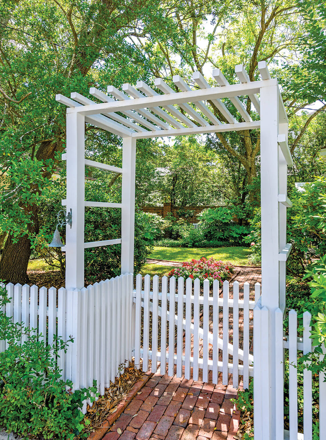 Counting down the centuries, the 1790 Nelson House anchors the 200 block of Front Street in Old Town Beaufort. A 19th-century trellis marking the garden entrance is festooned with climbing sweetheart roses that burst into bloom each May, beckoning passersby to peer into the lush grounds in spring and summer. Inside, the winding staircase is unique to the home’s period. Three baskets of vintage bottles have been passed from one homeowner to the next. And an antique walking wheel — in the Sutton family since 1958 and now a fixture in Jerri Sutton’s sitting room — once allowed women to walk to and fro while spinning yarns.