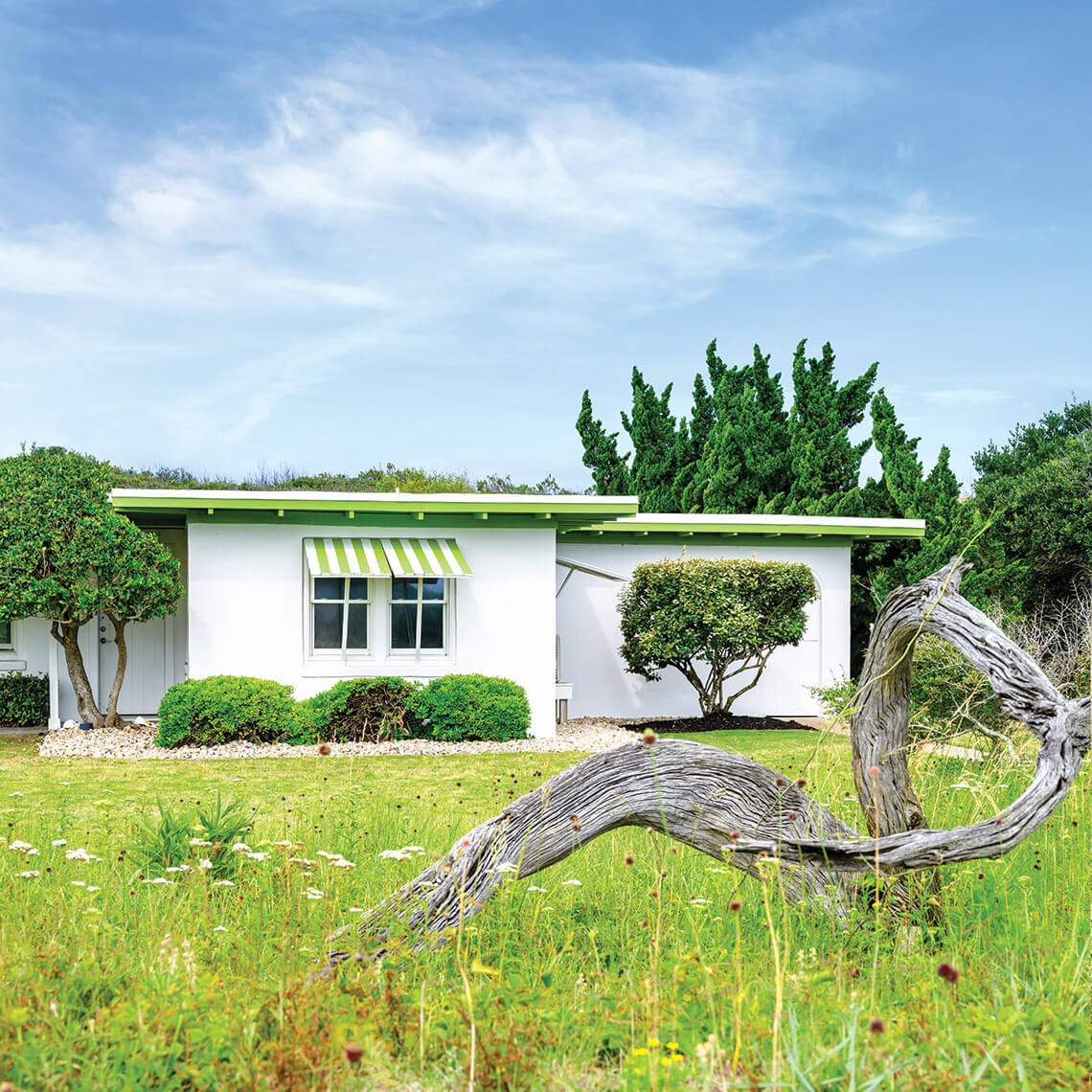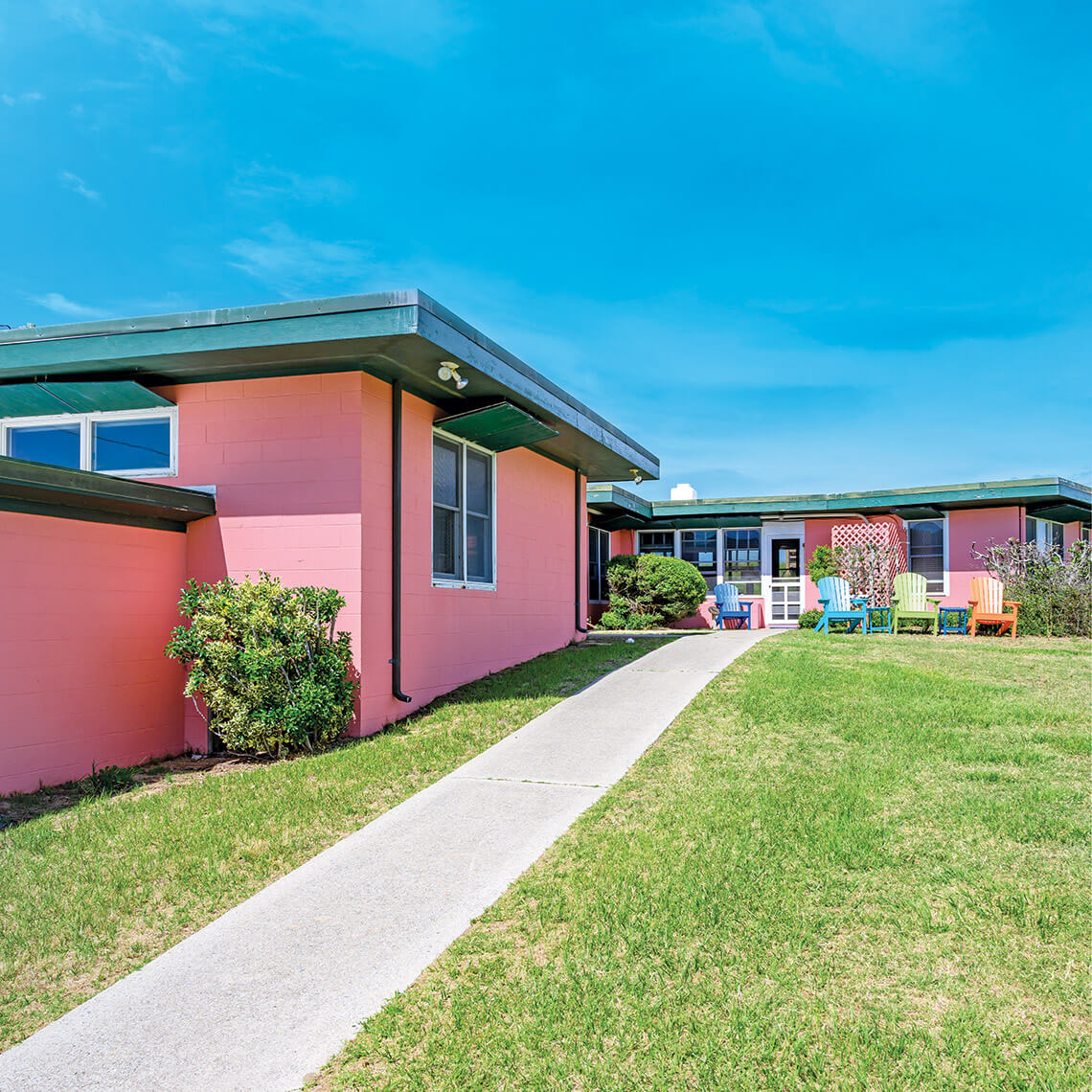 Think of these houses as dunescapes re-created in lines and blocks. Open wood soffits show structural elements from the inside out. Little lumber was used to build the outer shells, which were made from sand and sediment. These designs, borrowed from Prairie and Bauhaus styles, were cemented into a rustic mid-century vernacular by maverick builder and real estate visionary Frank Stick. A talented artist and commercial illustrator, the national parks conservationist christened Southern Shores and built his first block cottages on the oceanfront in 1947. Some folks thought he was plumb crazy — but not Peter Dunne, whose family owned and relished one of the Ocean Boulevard originals. “Arriving, driving up, opening the door — you get that wonderful cedar smell,” Dunne recalls. “You open the back door, you get the ocean smell, and you’re home.”