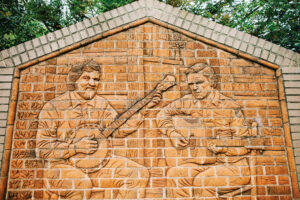When Doc Watson touched the brick sculpture made by Reidsville artist Brad Spencer at the Garden of the Senses, the guitarist recognized himself and his son. photograph by Revival Creatives