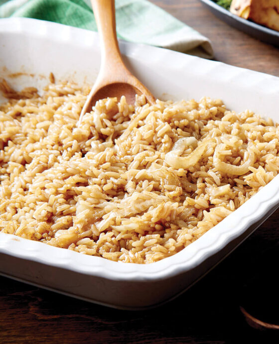 Yield: 6 servings. 1 stick salted butter 2 cups uncooked long-grain white rice 2 (15-ounce) cans beef consommé 1 yellow onion, sliced thin Preheat oven to 350°. Prepare a 9