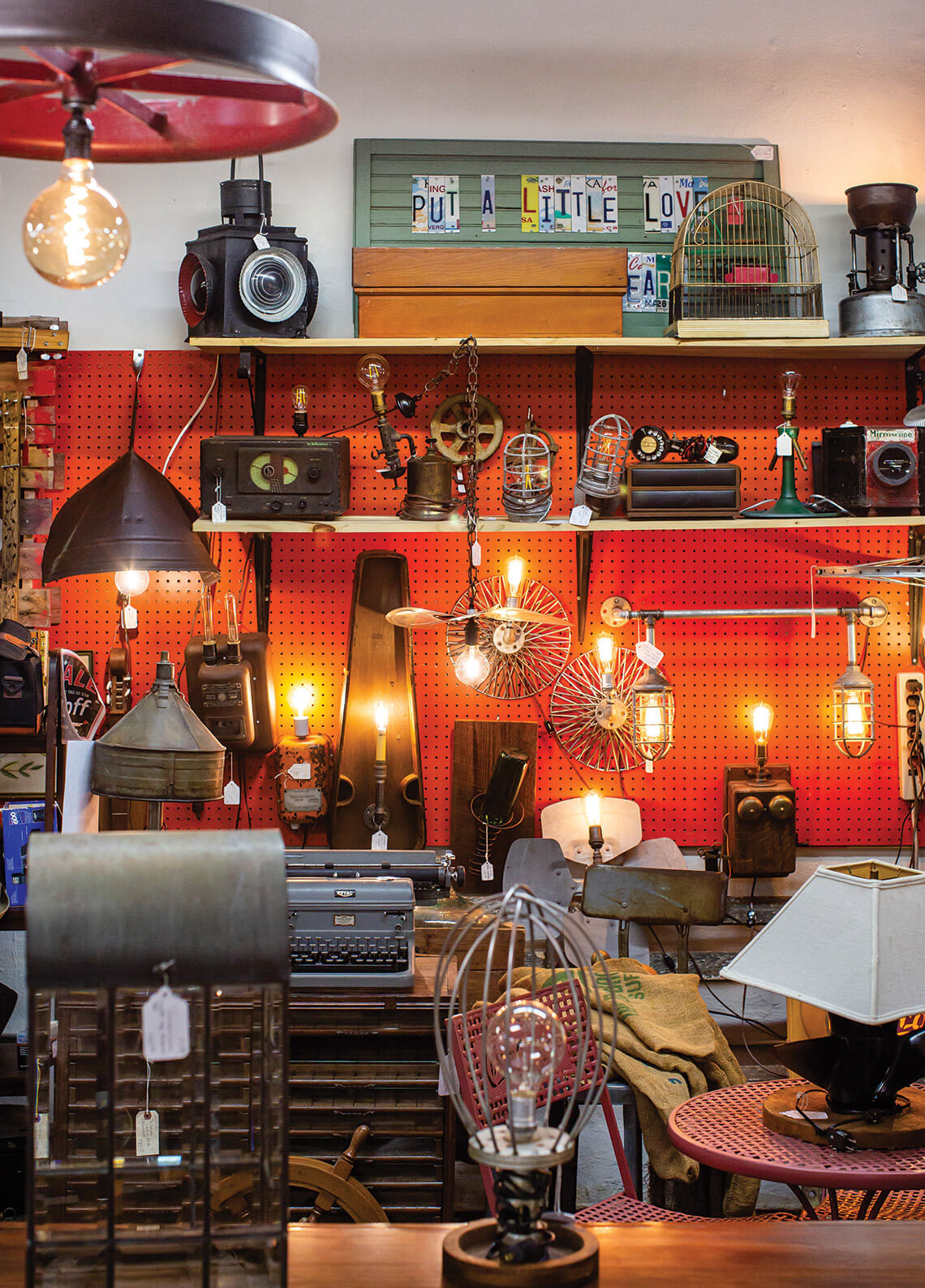 Wanda and Phil Sykes’s booth inside the cavernous mill glows warmly. To make their unusual light fixtures, they repurpose items — like old radios, chicken feeders, and tobacco setter wheels — found at auctions and estate sales. photograph by Tim Robison