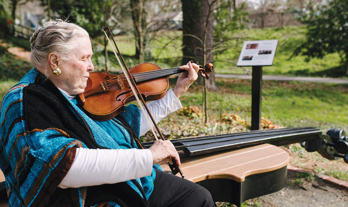 At the downtown “history grove” honoring Dorothy Kitchen, founder and director of the Duke University String School, a violin-shaped bench offers seating for visitors — and, occasionally, violinists. Photography courtesy of Durham Magazine