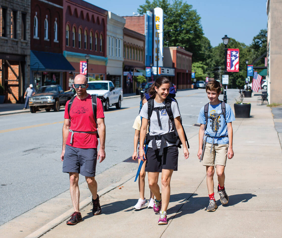 Hikers on the Mountains-to-Sea Trail, which runs down the sidewalk through downtown Elkin. photograph by Revival Creatives