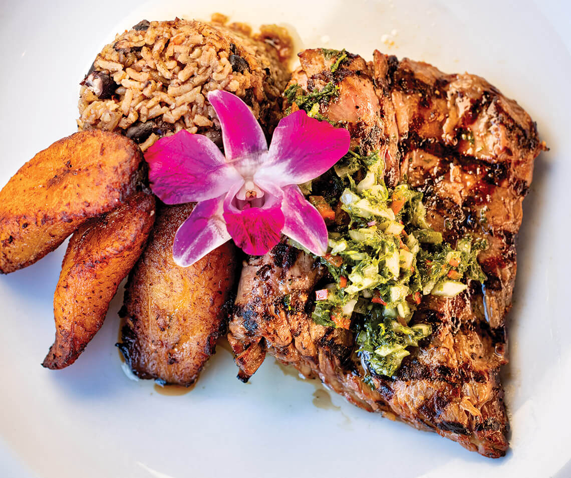 At Brisas Latin Cuisine, try the Brisas Churrasco — skirt steak with chimichurri, plantains, and rice. photograph by Charles Harris