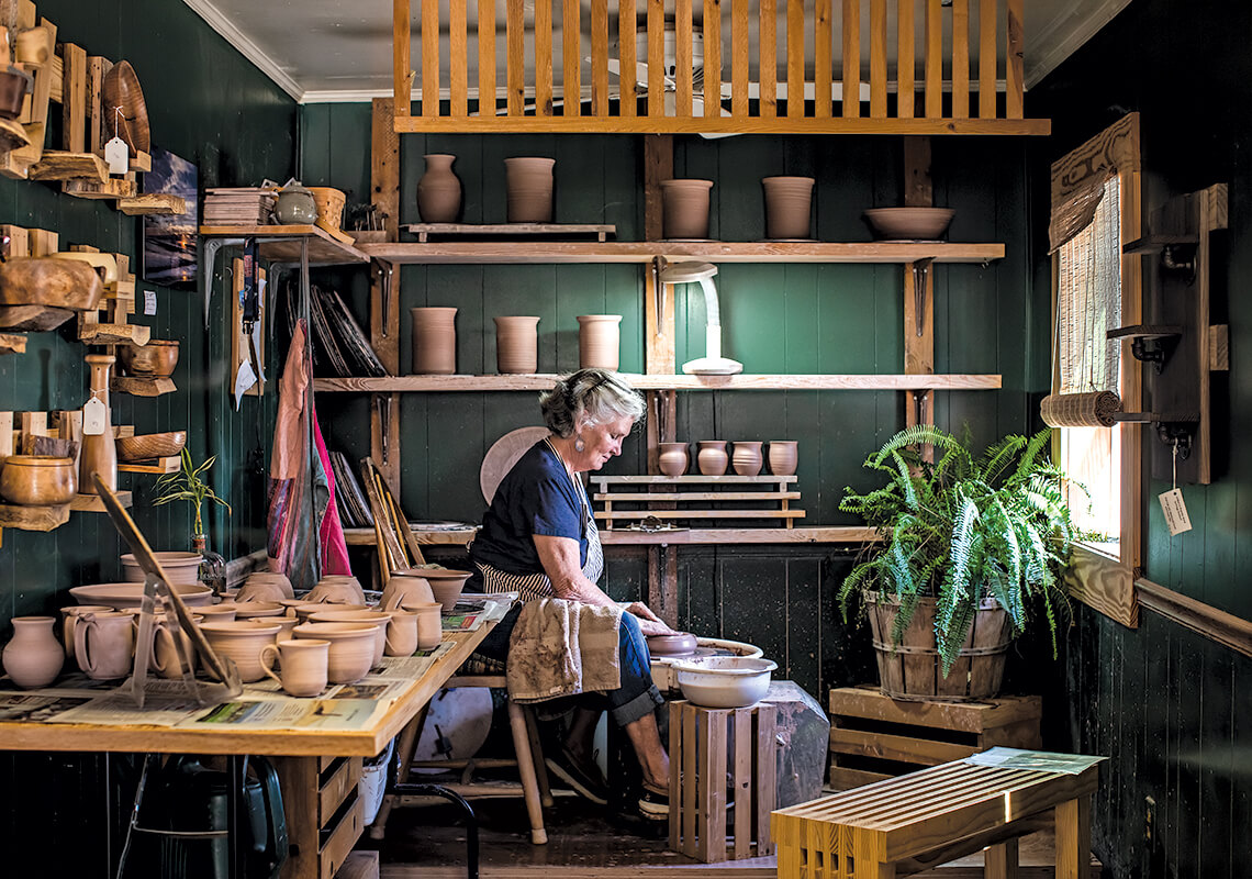 Wanchese Pottery. Bonnie and Bob Morrill have been selling their pottery out of a cottage on Fernando Street for almost 30 years. Visitors can sometimes see Bonnie (above) at work at her potter’s wheel inside the shop. “The connection to the community that they have, the welcoming spirit that they have, is just an example of the type of merchants we have in town,” Malcolm says.